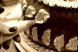 A woman pastry chef with a pastry bag in her hands squeezes cream on a cake in a home kitchen. Professional chef at work on bakery kitchen. culinary, baking and cooking food concept, home cooking