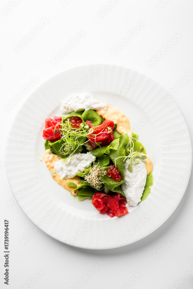 Gourmet dish with green pasta, burrata cheese, cured fish slices, fish roe, microgreens, and yellow sauce on a white plate. Fine dining presentation, top view.