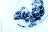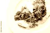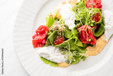 Gourmet dish with green pasta, burrata cheese, cured fish slices, fish roe, microgreens, and yellow sauce on a white plate. Fine dining presentation, top view.