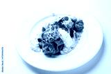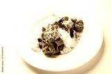 Gourmet dish with green pasta, burrata cheese, cured fish slices, fish roe, microgreens, and yellow sauce on a white plate. Fine dining presentation, top view.