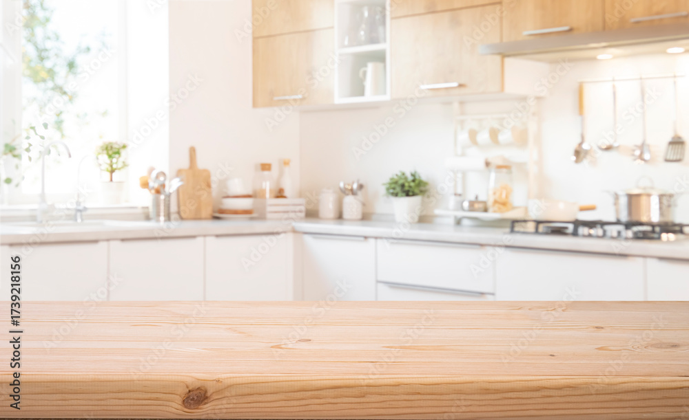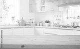 Food presentation background with empty wooden table top in front of blurred modern kitchen workspace interior