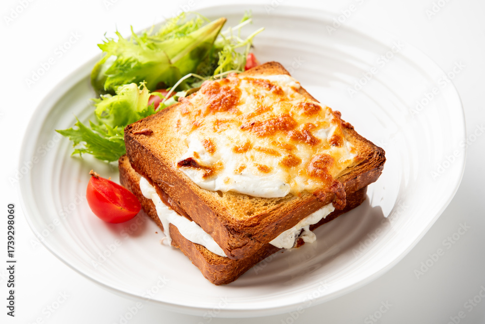 Toasted bread with melted cheese served on a white plate alongside a fresh salad of mixed greens and cherry tomatoes. Minimalistic presentation, top view, daylight.
