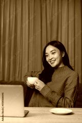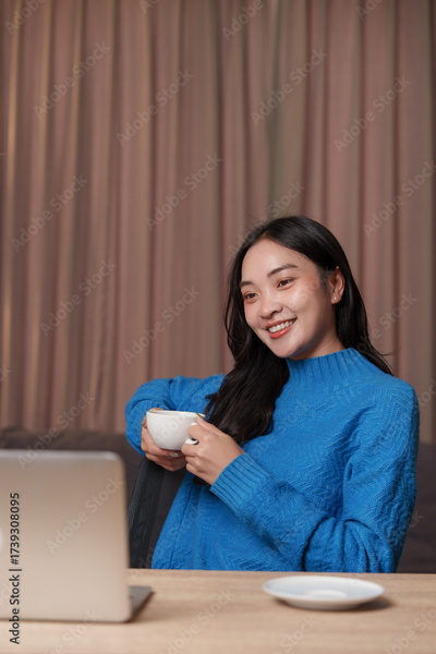 Woman smiling while working on laptop, drinking coffee