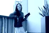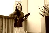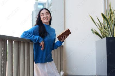 Young woman smiling while holding book on balcony