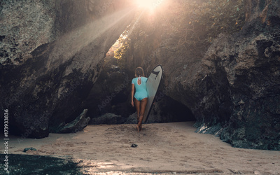 Beautiful young woman in bikini with surf board at beach of tropical island.