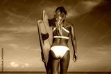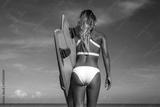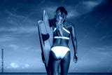 Beautiful young woman in bikini with surf board at beach of tropical island.