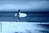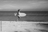 Beautiful young woman in bikini with surf board at beach of tropical island.