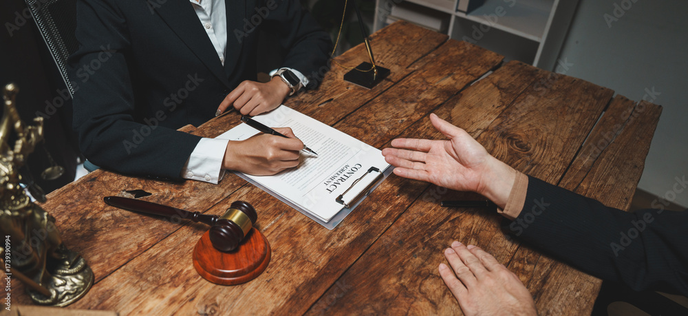 Lawyer advising client and signing contract agreement