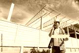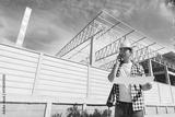 Construction engineer managing building project on phone
