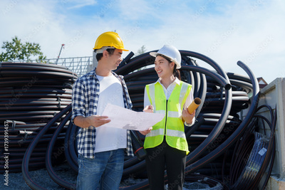 Engineers discussing construction project plans on site