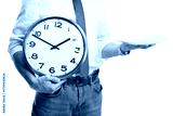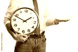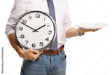 Man holding an empty plate and a clock