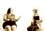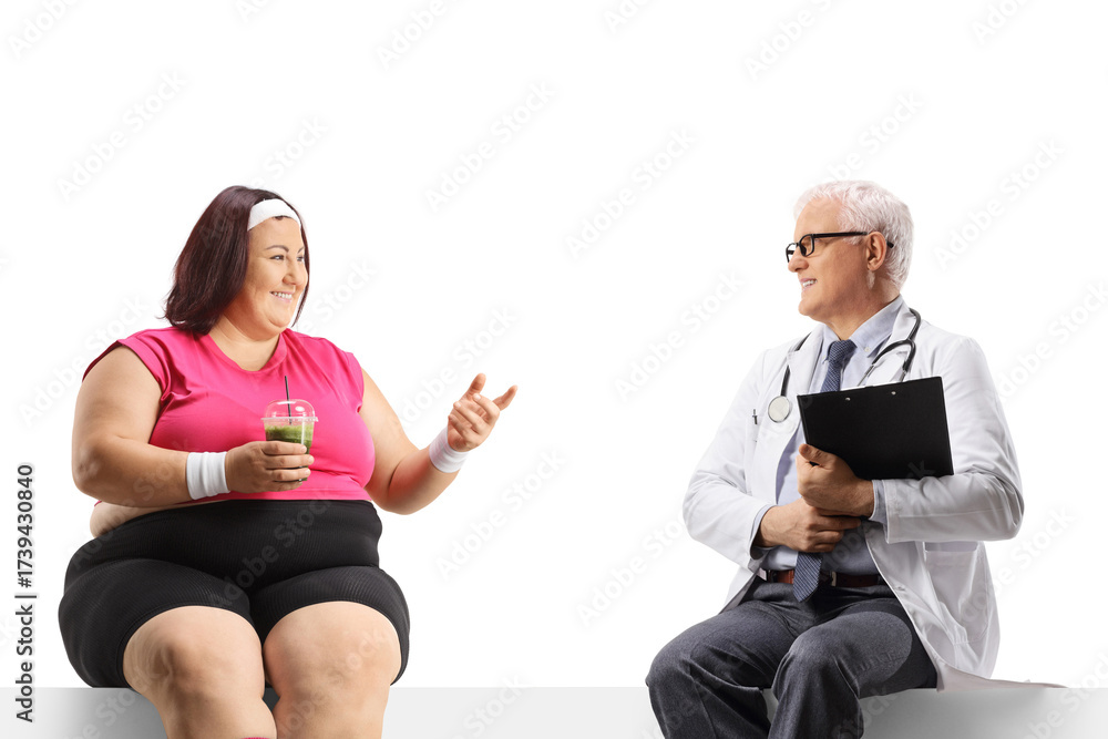 Overweight woman talking to a male doctor and sitting on a blank panel