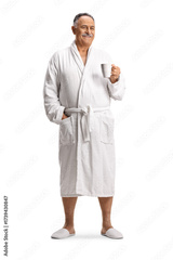 Mature man in a white bathrobe holding a cup