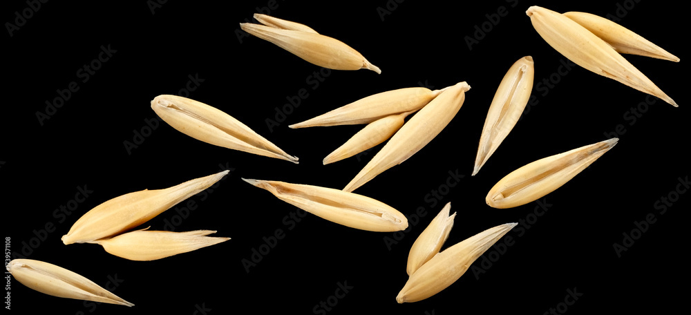 Falling oat seeds isolated on black background, falling oat grains collection, macro