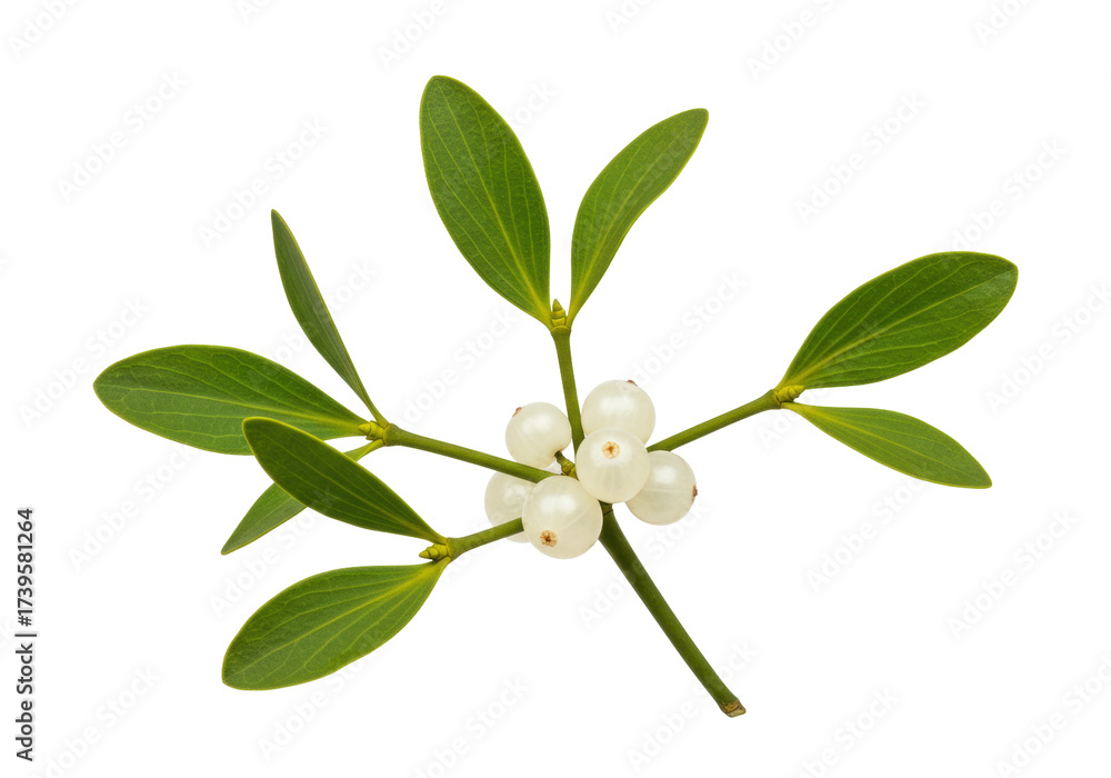 Mistletoe branch with green leaves and white berries isolated on transparent background, traditional Christmas decoration PNG