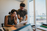 Couple consulting with a professional advisor in a bank office, discussing financial matters such as loans and inquiries, creating a collaborative and productive atmosphere during their meeting.