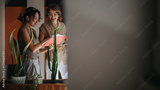 Two women are discussing documents together in a well-lit office decorated with plants. The atmosphere portrays teamwork, creativity, and an efficient workspace.