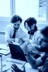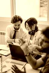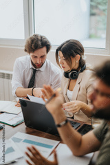 Group of colleagues collaborating on a project around a desk with documents and a laptop in a bright office setting. They focus on discussing details and exchanging ideas to achieve solutions.