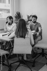 Group of colleagues collaborating and exchanging ideas in a cozy modern office environment.