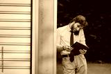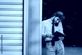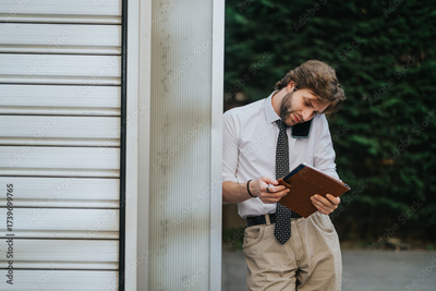 A professional in business attire speaks on the phone while reviewing a tablet, symbolizing multitasking, efficiency, and modern work ethics in an outdoor setting beside a structured background.