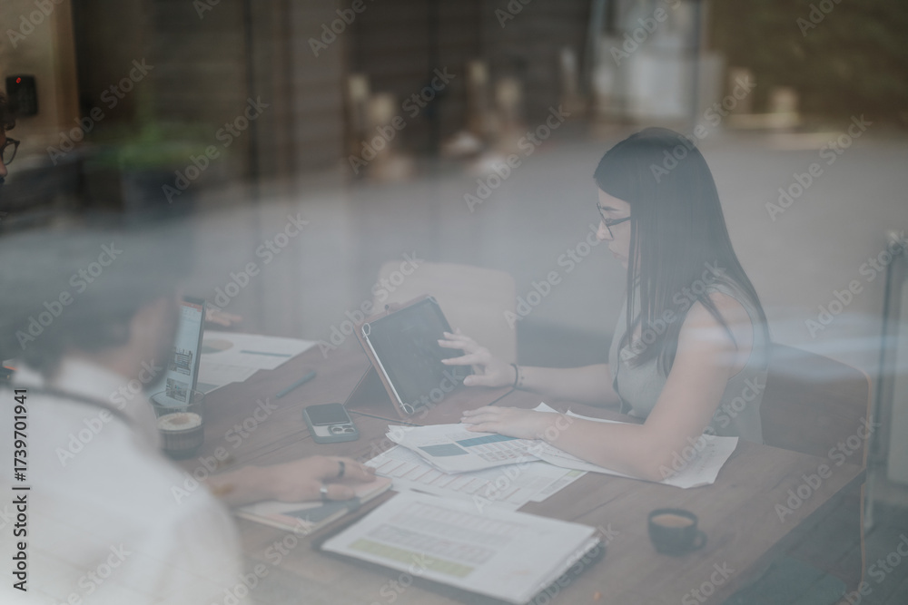Colleagues collaborating at a desk, using technology and printed documents in a professional workspace.