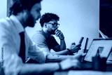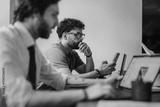 Men working together on tasks at their desk using laptops and smart phones in an office.