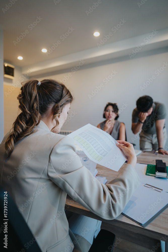 A couple consulting with a financial adviser at a bank, discussing loan options. The adviser presents financial documents as the couple listens carefully in a modern, professional office environment.