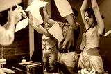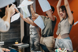 A joyful scene of colleagues throwing documents into the air, celebrating success or achievement. The setting is a lively meeting room, expressing accomplishment, happiness and positive collaboration.
