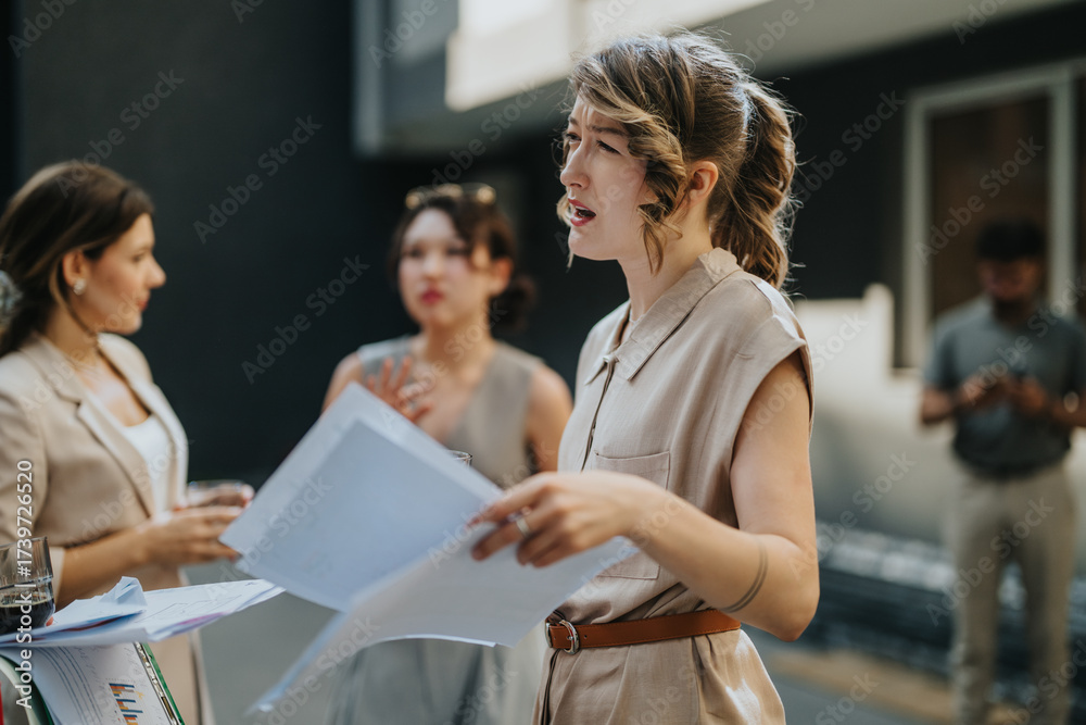 Colleagues gathered outdoors, engaged in a focused discussion while reviewing financial reports and ideas.