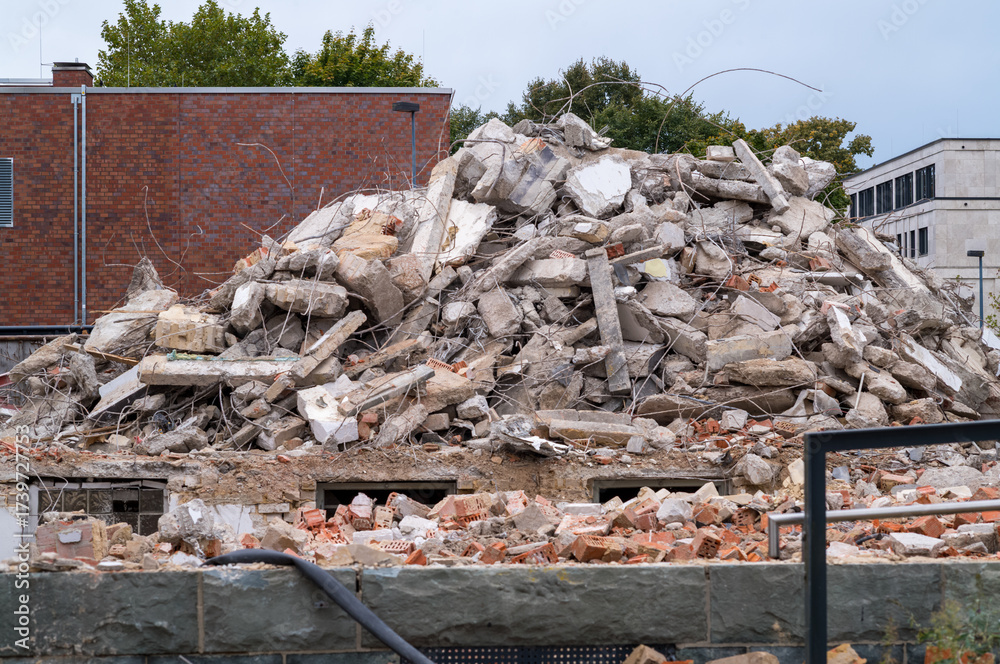 Large pile of building demolition rubble and debris