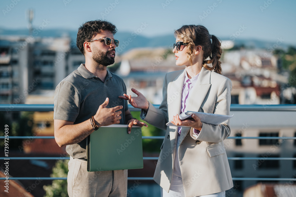 A business meeting between two colleagues discussing documents while standing on a rooftop terrace at sunset.