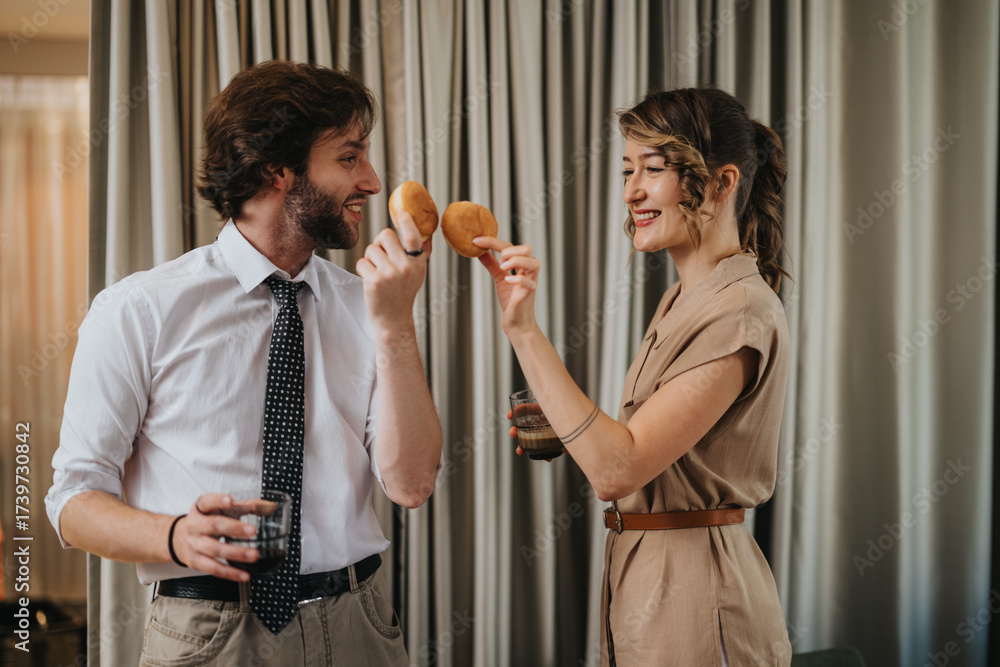 Two colleagues engage in a lighthearted interaction, clinking their pastries together in a toast while holding drinks, creating a relaxed and friendly atmosphere during an informal office gathering.