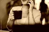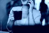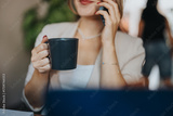A woman holds a coffee mug and talks on her phone, conveying relaxation and multitasking.
