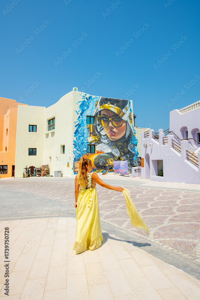 Colorful shopping villa's at old port mina park Qatar with selective focus.