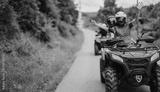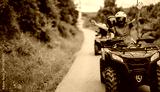 A group of people riding quad bikes along a lush green rural road, wearing helmets for safety.