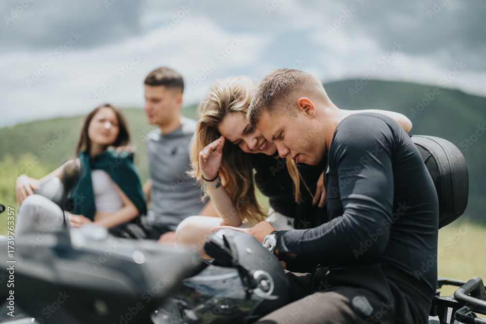Friends sharing a joyful moment during a quad biking adventure outdoors. They are surrounded by a scenic landscape, enjoying outdoor activities, and conveying feelings of togetherness and leisure.