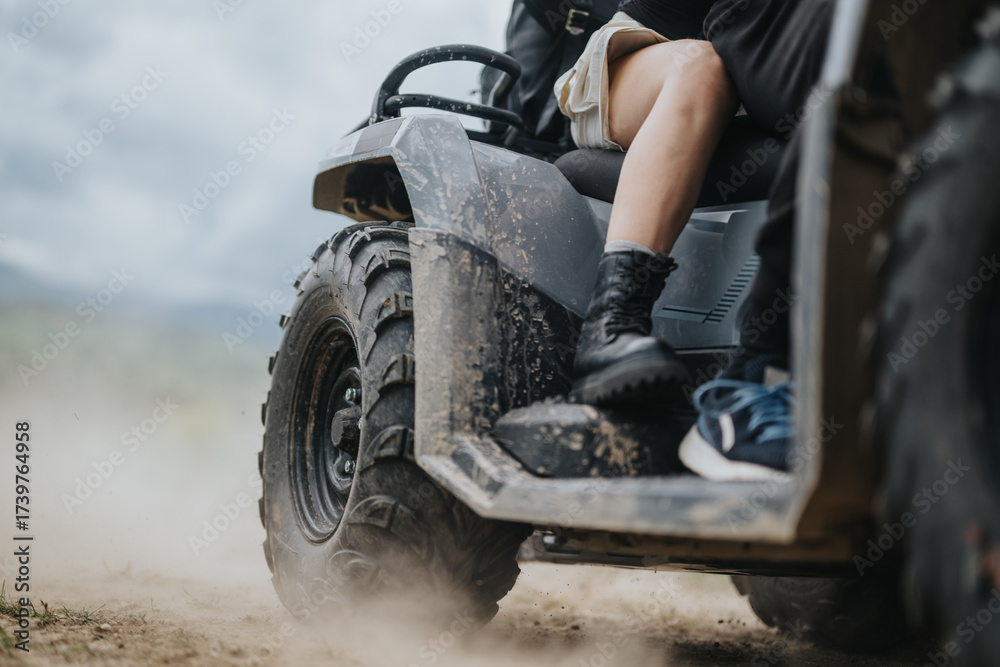 Focused shot of an ATV's wheel and passengers enjoying a dusty off-road adventure.
