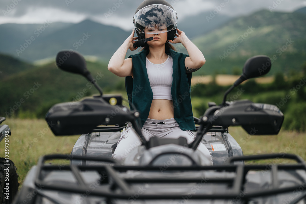 A person fixes a helmet while seated on a quad bike, surrounded by a scenic landscape.