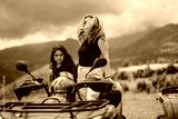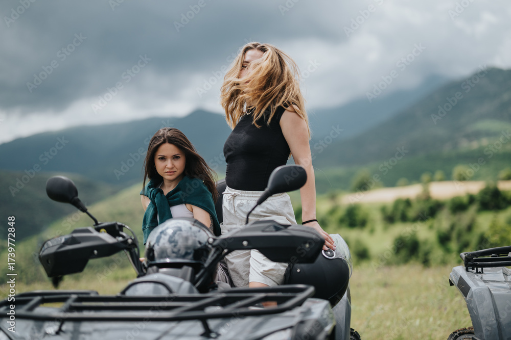 Two friends are enjoying a quad ride in a beautiful mountainous landscape under overcast skies.