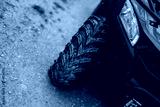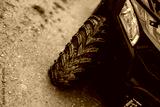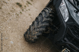 A detailed view of a rugged off-road tire attached to a powerful vehicle, showcasing its tread design on a dirt track. Ideal for depicting adventure, automotive, and outdoor exploration themes.