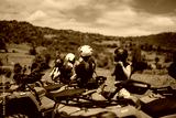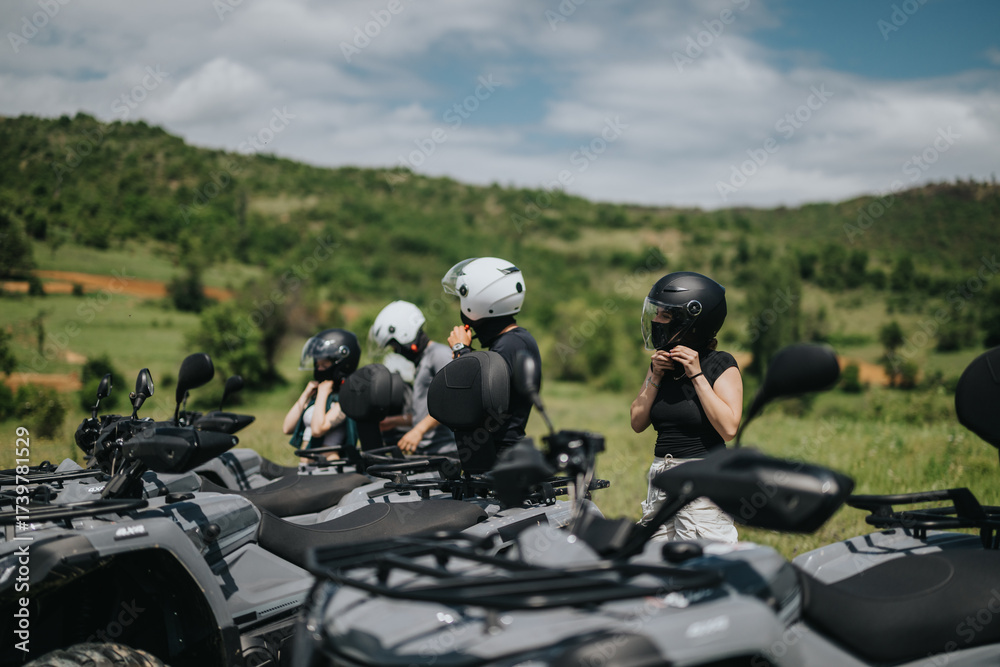 Four people secure their helmets while standing beside quad bikes, surrounded by stunning green landscapes.