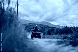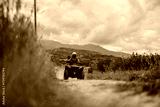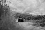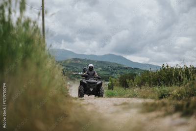 Two friends enjoying an adventurous ride on an ATV along a scenic dirt road surrounded by lush greenery and mountain views. The clouded sky adds a dramatic backdrop to the rural landscape.