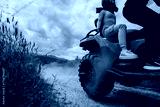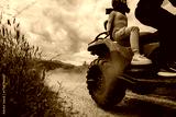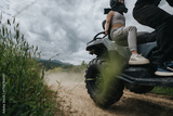 Two individuals riding an all-terrain vehicle along a dirt path surrounded by nature and grasslands, creating a thrilling outdoor adventure under a cloudy sky.