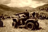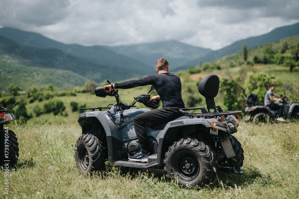 Adventure enthusiasts exploring nature on rugged quad bikes. Outdoorsy fun in scenic landscapes with friends enjoying an exhilarating experience across fields and terrain.