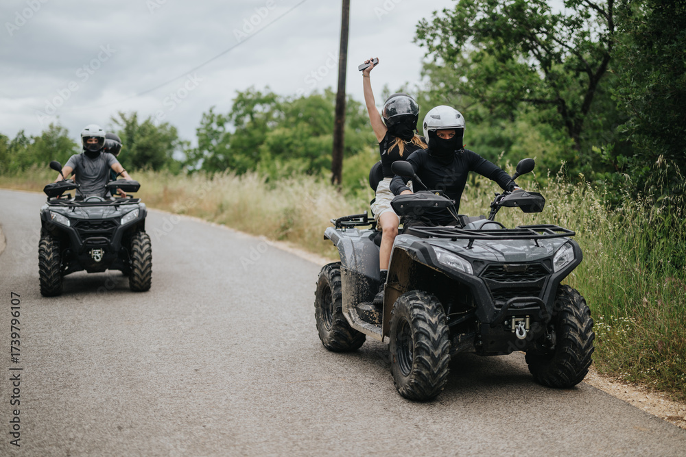 A group of friends riding ATVs on a quiet scenic road, wearing helmets for safety and enjoying a fun outdoor activity in the countryside, surrounded by lush greenery.