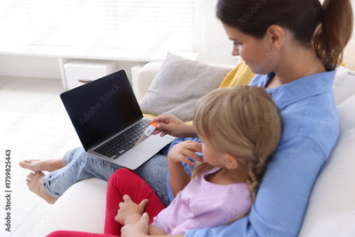 Telehealth. Mother and her sick daughter having online consultation with doctor via laptop on sofa at home