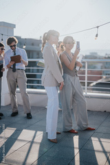 A business gathering on a rooftop terrace during sunset, featuring social interactions, discussions, and a modern urban setting.
