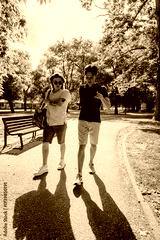 Two friends engage in casual conversation while walking along a shaded pathway in a park. The sunny day and lush surroundings enhance the relaxed and sociable atmosphere of their interaction.