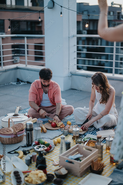 Group of friends enjoying a picnic on a rooftop with food, drinks, and decorations, creating a cozy atmosphere. They are engaged in preparing and sharing food, emphasizing friendship and celebration.