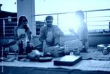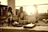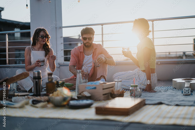 A scenic rooftop gathering showcasing friends dining and socializing in a relaxed atmosphere with warm evening light.